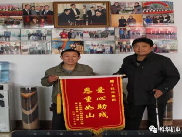 2013年10月,孫繼發(fā)資助的坊子區(qū)殘疾人創(chuàng)業(yè)者劉乃輝到公司贈(zèng)送錦旗表達(dá)感激之情。